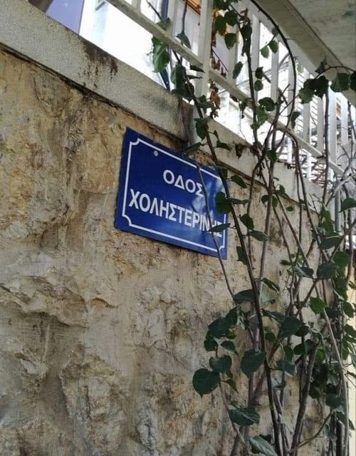 Επειδή, με όλες τις φωτοσοπιές που κυκλοφορούν και την ΤΝ, έχω γίνει καχύποπτος, έψαξα στους χάρτες της Google και δεν βρήκα ούτε Οδό Χοληστερίνης ούτε Πλατεία Τριγλυκεριδίων. Βλέπω όμως ότι υπάρχουν πολλοί δρόμοι που φέρουν αυτό το ανεπίσημο όνομα, προφανώς επειδή φιλοξενούν πολλά μαγαζιά για μη χορτοφάγους. Δεν λέω ότι είναι φωτοσοπιά η φωτογραφία, μια και μπορεί να πρόκειται για ιδιωτική πινακίδα. Όπως ιδιωτική είναι η πινακίδα «Πλατεία Μάνου Χατζιδάκι» στην είσοδο του μαγαζιού όπου σύχναζε ο Μάνος Χατζιδάκις στην επισήμως ονομαζόμενη Πλατεία Προσκόπων.