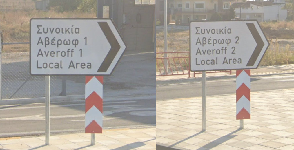 Μια και είμαστε στα μαργαριτάρια της οδοσήμανσης, μπορεί να φανταστεί κανείς σε ποιον απευθύνεται η προειδοποίηση "Προσοχή παιδιά";Αλίευσα από το ΦΒ μια αναφορά σε αυτές τις δύο πινακίδες έξω από τη Λάρισα. Η ερώτηση αφορούσε το όνομα, που όντως θα περίμενε κανείς να μεταγραμματιστεί ως «Averof» και όχι να γραφτεί με ξένη ορθογραφία. Εμένα όμως μου τράβηξε περισσότερο την προσοχή αυτό το «Local Area»… Κάτι σε District ή Quarter δεν θα ήταν πιο λογικό;